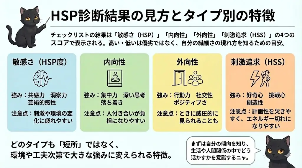 この4つの傾向を組み合わせることで、あなたの繊細さのタイプが見えてくるニャ。