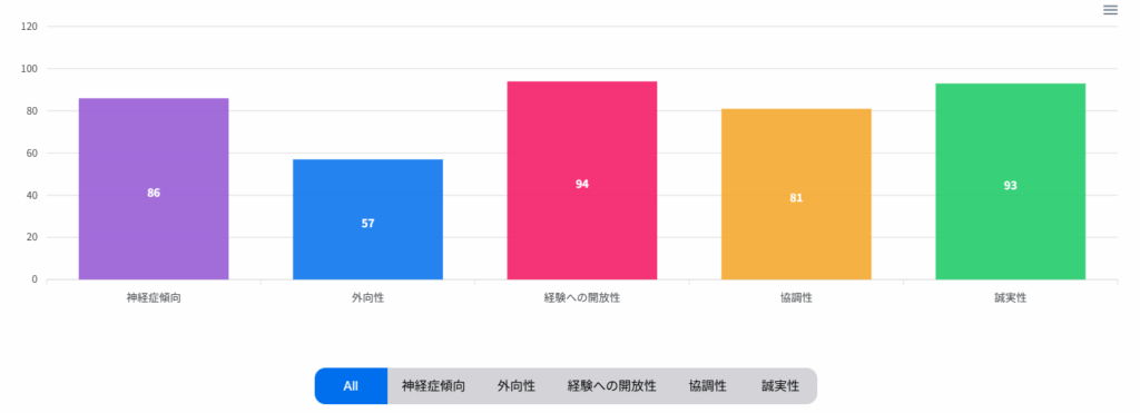 少し抽象的に思えるかもしれませんが、今の自分の特徴を理解するうえで最も信頼できる枠組みの一つです。ここでは私の診断結果を紹介します。